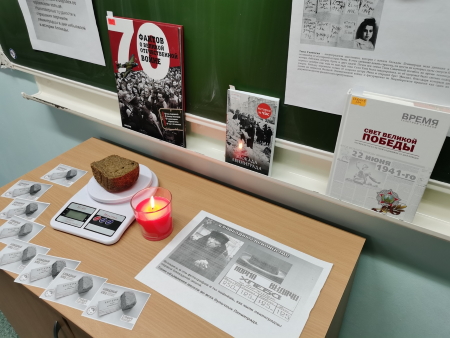 Аптрахимова А.А., педагог – библиотекарь школы рассказала о трудностях и страданиях, которые пришлось пережить Ленинграду, о норме выдачи хлеба и хлебной карточке блокадника.