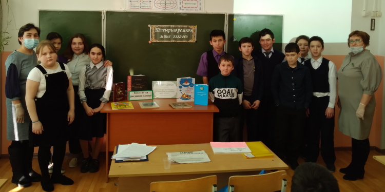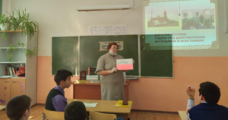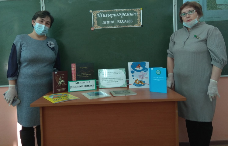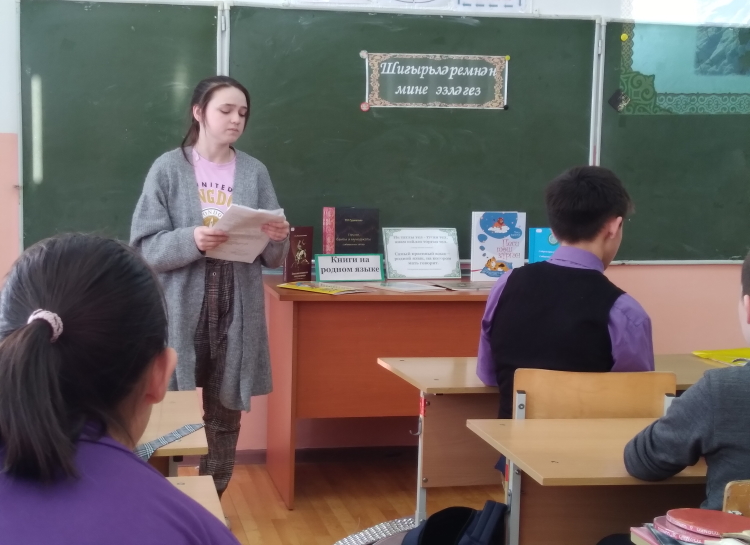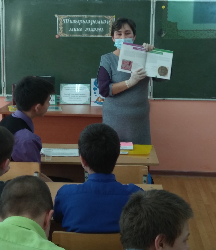 Для школьников была подготовлена небольшая книжная выставка «Книги на родном языке». В 2020 году было большое поступление книг на татарском языке. Детей ознакомили с новинками наших библиотек. Их очень заинтересовали книги «Сибирскотатарско-русский словарь», «Шигырь Алифба», «Алтын кош».
