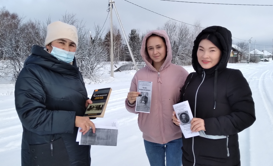 На улицах поселений сотрудники библиотек и волонтеры жителям района задавали простые вопросы по творчеству Федора Михайловича и за правильные ответы участникам вручали информационные буклеты «Читаем Федора Достоевского».